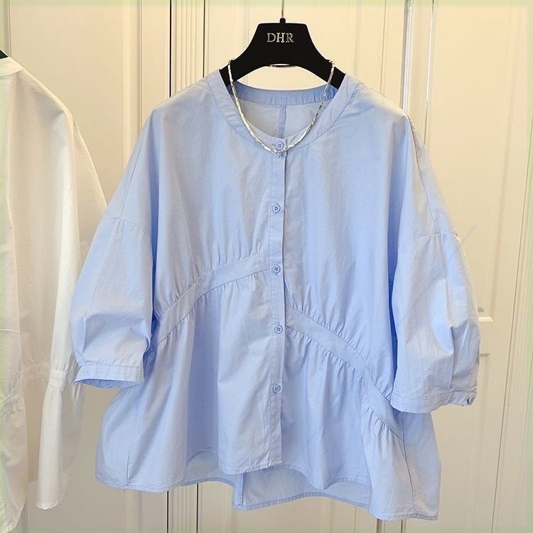 茂友服饰纯棉设计感2021韩版宽松不对称褶皱拼接娃娃衫衬衫上衣女热门设计联盟服务商