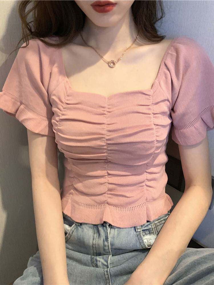 法式方领锁骨短袖一字肩上衣女甜美超仙气夏季设计感小众短款衬衫热门设计联盟服务商