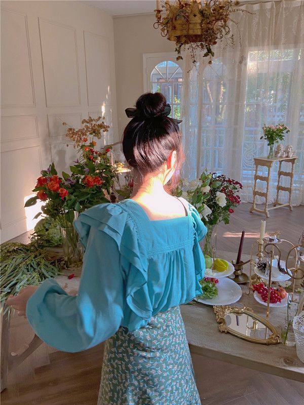 2021春季新款锁骨设计感小众长袖上衣木耳边蕾丝方领蓝色衬衫女热门设计联盟服务商